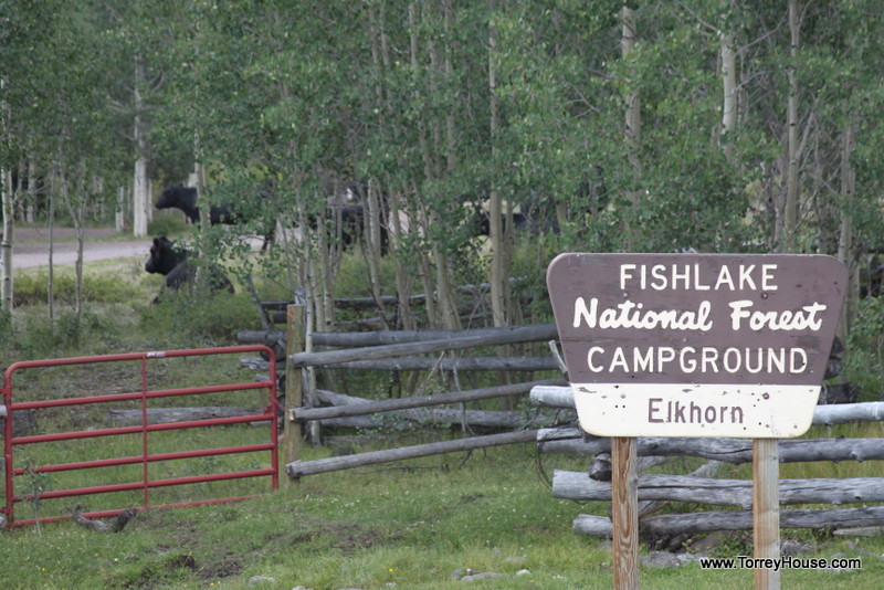 Cattle guard and fence at campground. Cows hang out at viewer’s right.