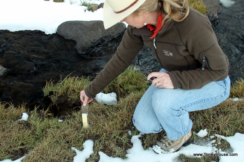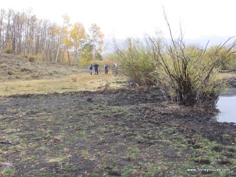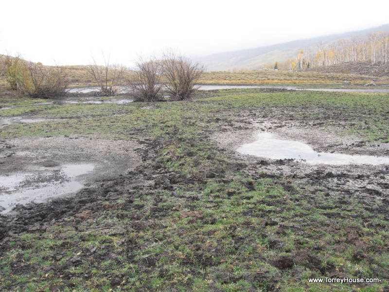 On the other side of the fence the grass was already overgrazed and gone. Ranchers and their apologists such as the responsible BLM agents call this a “sacrifice zone” saying that cattle will congregate along fences making things worse there than in general elsewhere. But in general cows are to be kept out of riparian zones. In fact, that is where they primarily hang out. We crossed the road and signed in at the trail head register. Behind the first row of willows it smelled and looked like we had walked into a stock yard. The trampled stream was at our feet and the cows were there strip mining away.